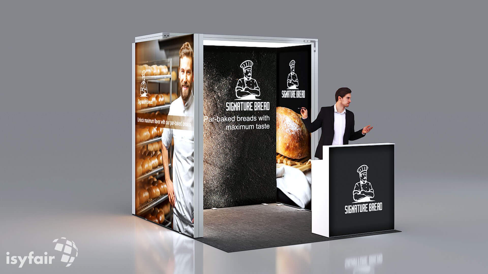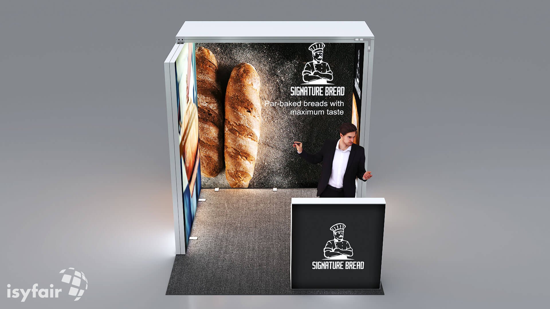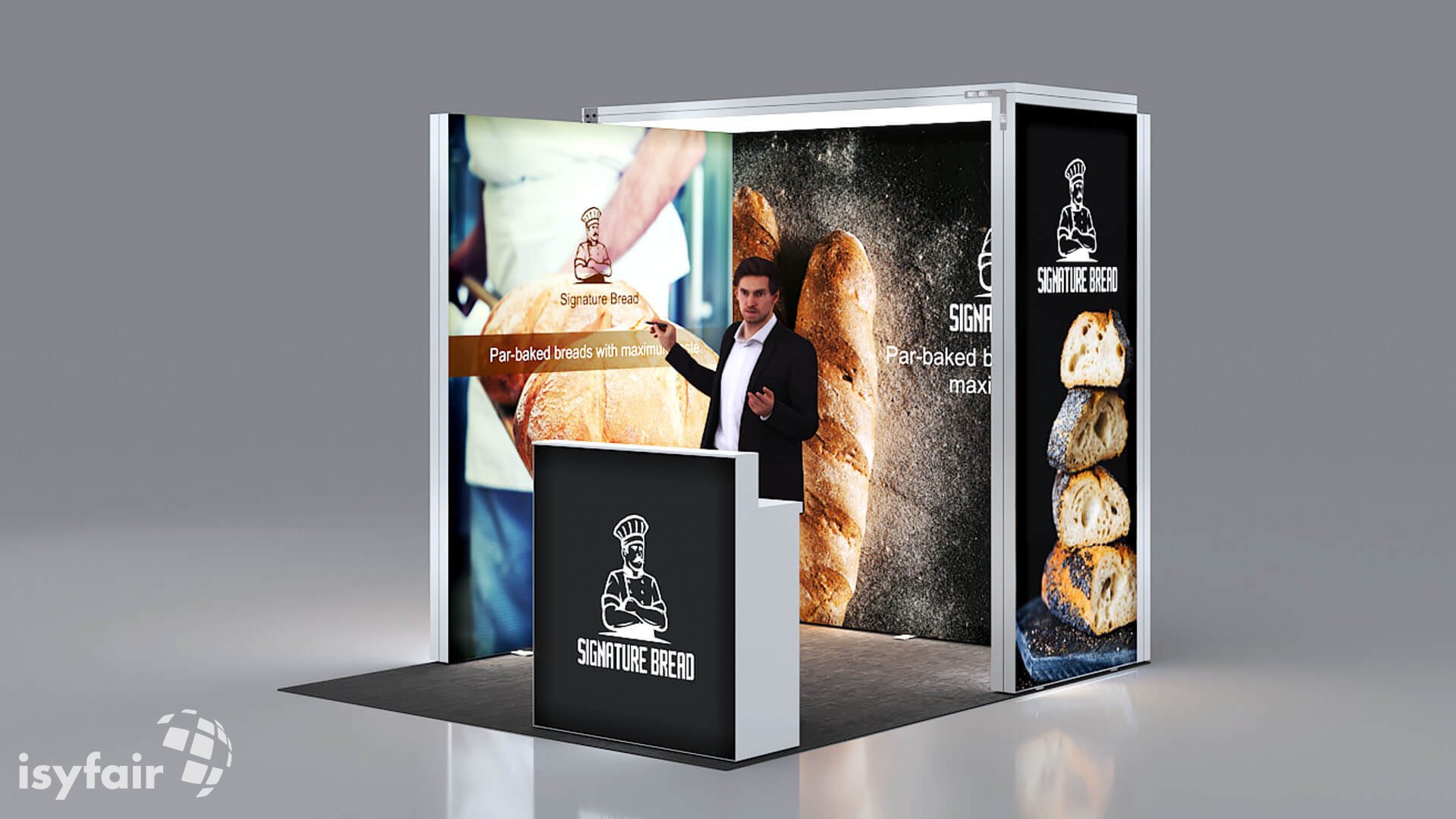Dit design kan natuurlijk helemaal worden aangepast naar jouw wensen en eisen. Laat ons weten wat je plannen zijn en welke eisen je stelt aan jouw stand, dan maakt ons design-team een concept op maat voor je. Stuur ons een mail op info@ISYFAIR.com of bel ons op (+31) (0) 6 22690489.