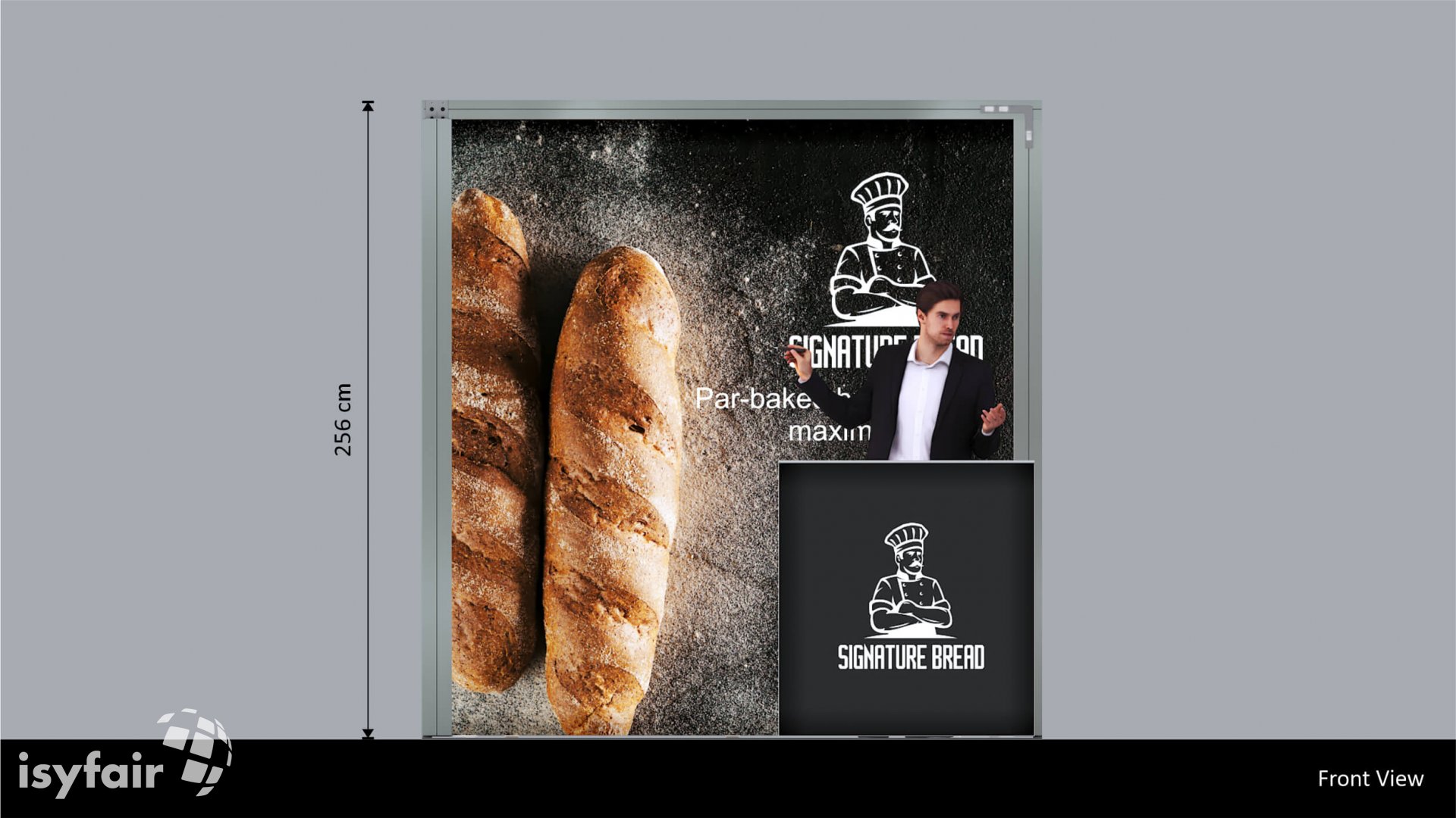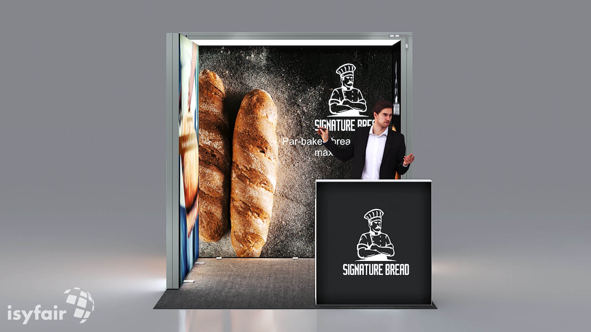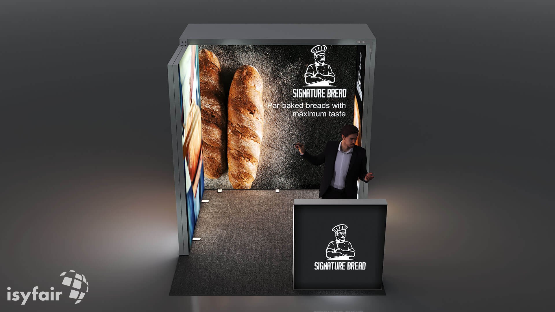 Dit design kan natuurlijk helemaal worden aangepast naar jouw wensen en eisen. Laat ons weten wat je plannen zijn en welke eisen je stelt aan jouw stand, dan maakt ons design-team een concept op maat voor je. Stuur ons een mail op info@ISYFAIR.com of bel ons op (+31) (0) 6 22690489.