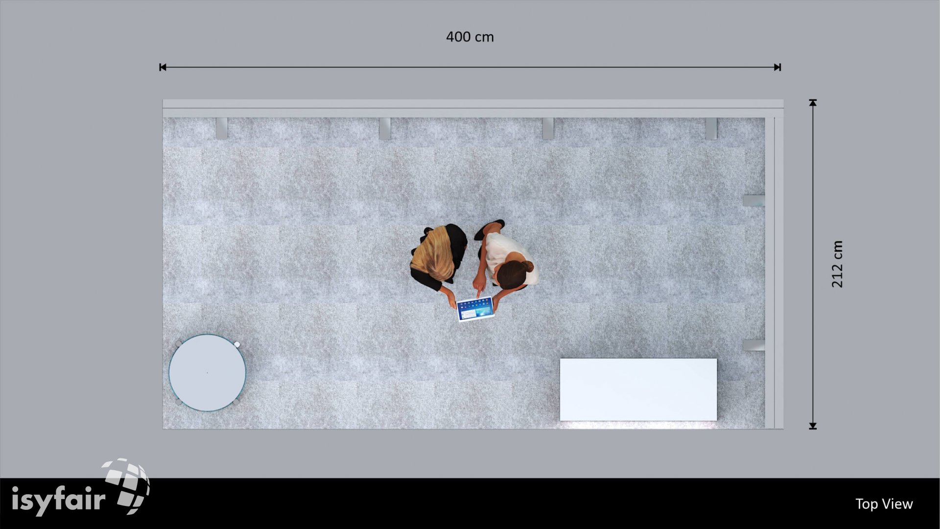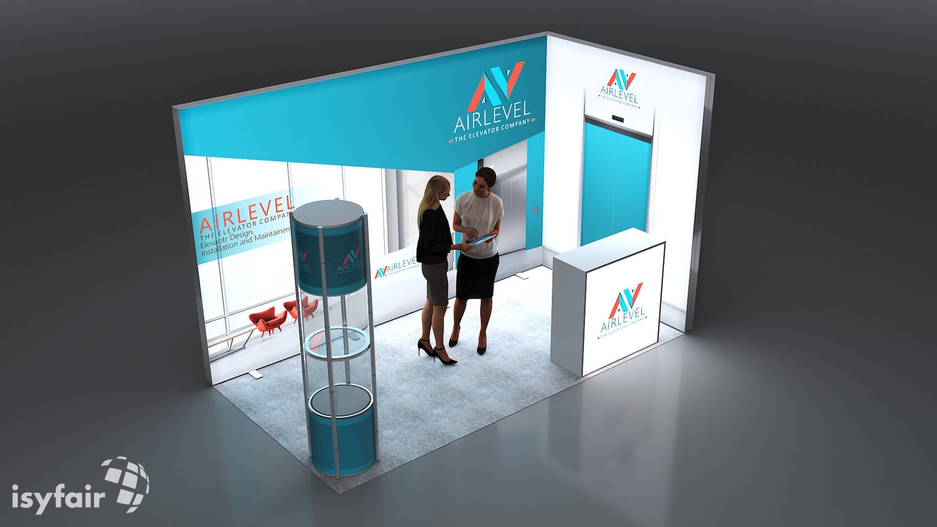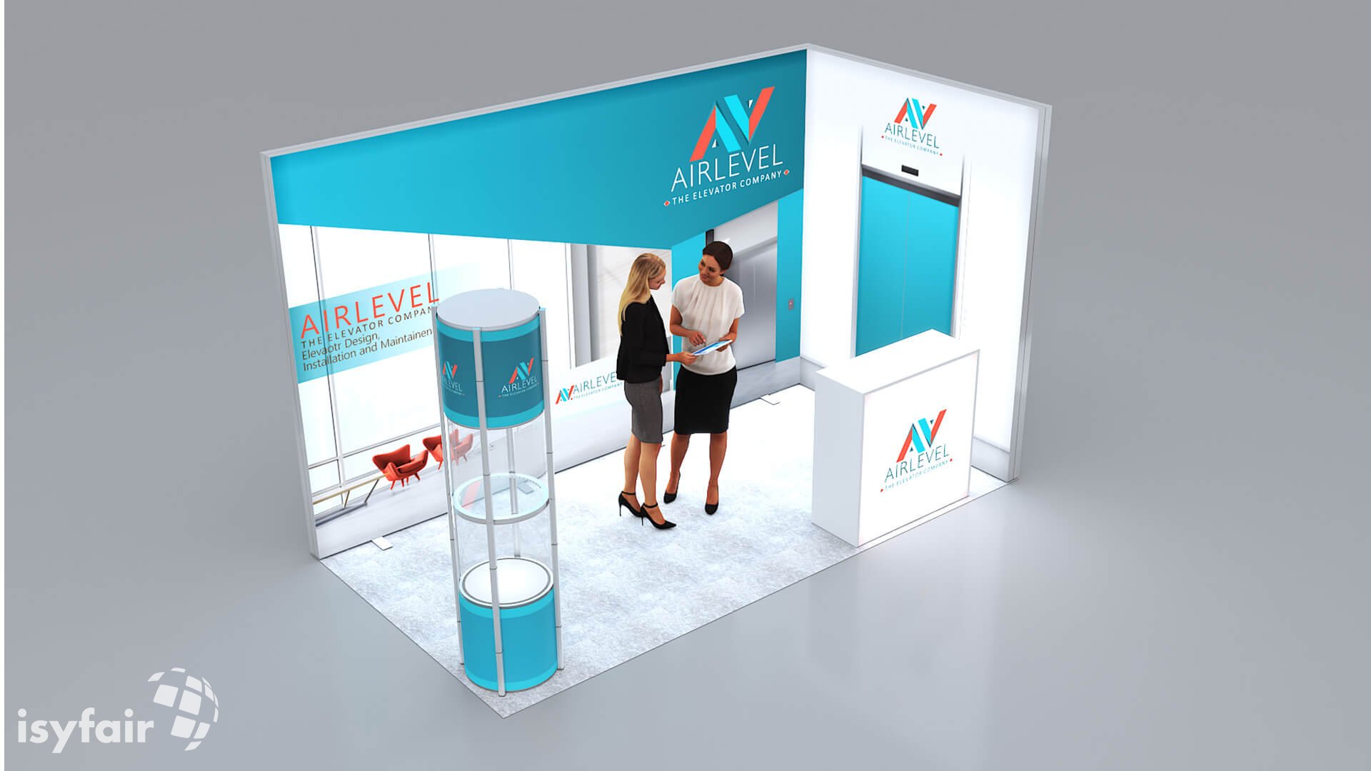 Dit design kan natuurlijk helemaal worden aangepast naar jouw wensen en eisen. Laat ons weten wat je plannen zijn en welke eisen je stelt aan jouw stand, dan maakt ons design-team een concept op maat voor je. Stuur ons een mail op info@ISYFAIR.com of bel ons op (+31) (0) 6 22690489.