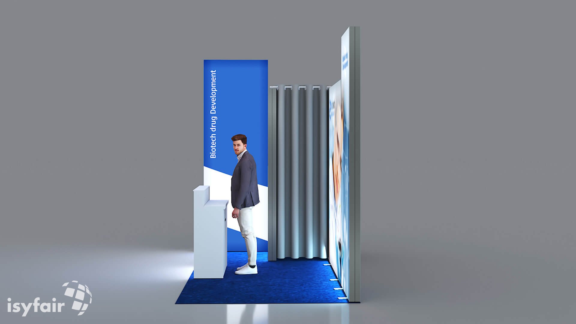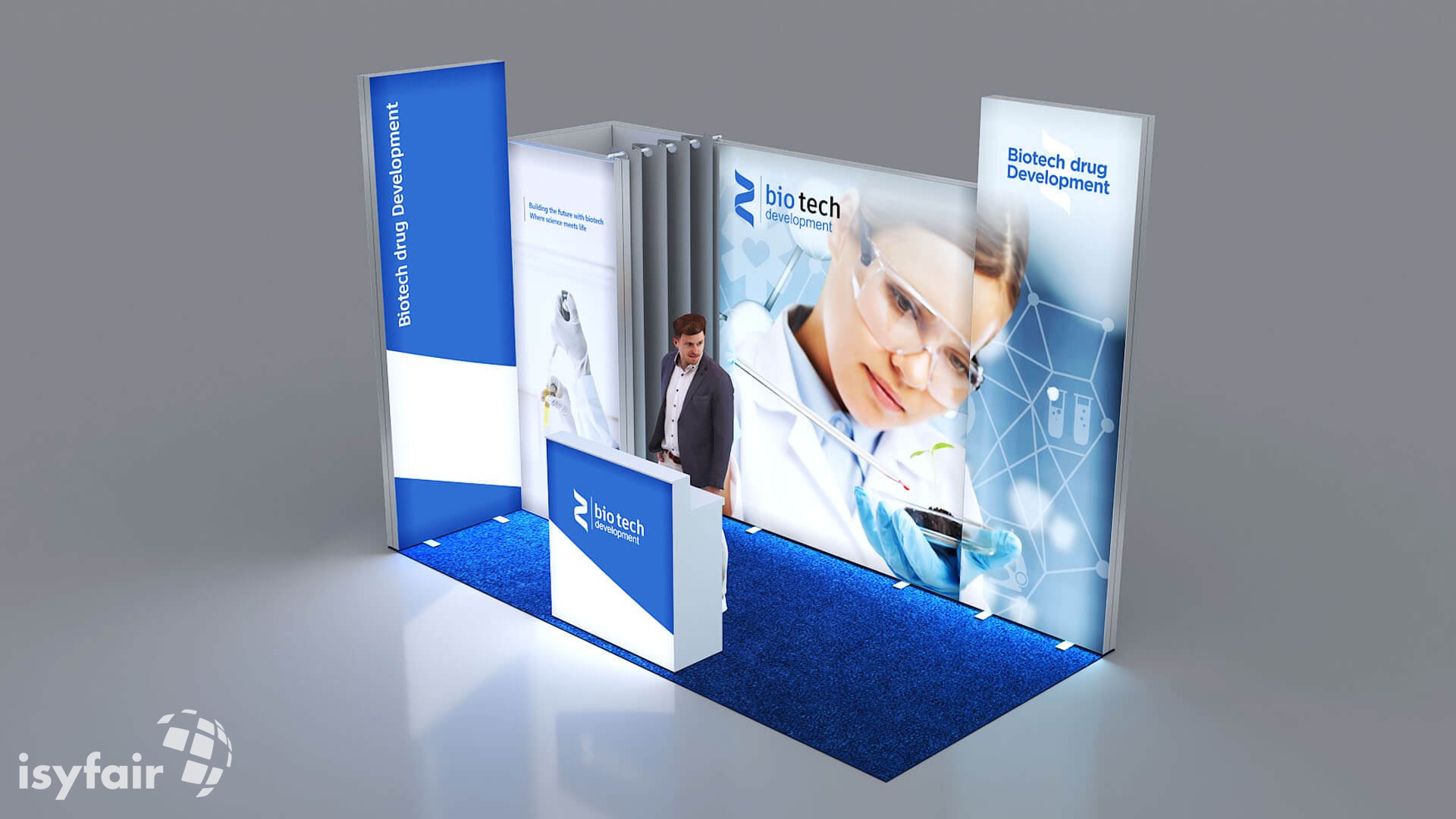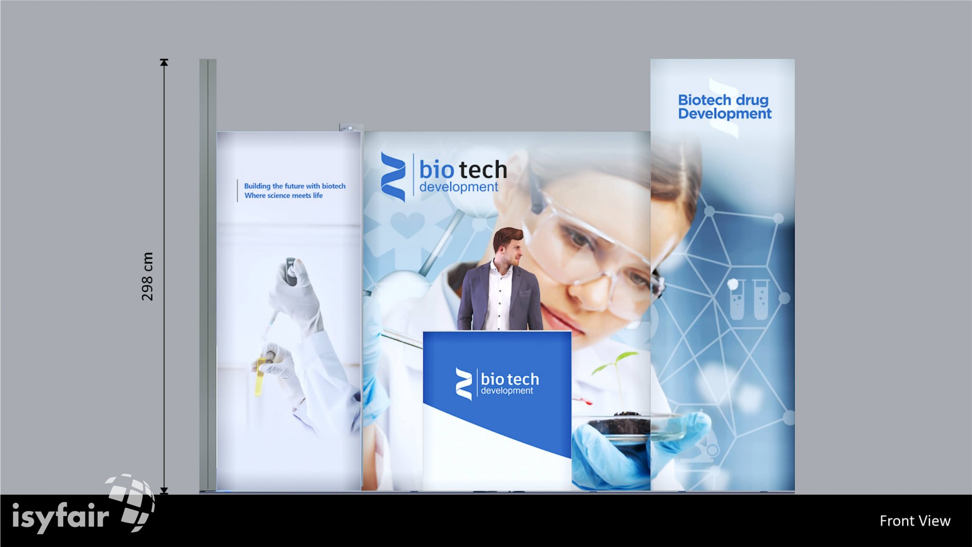Dit design kan natuurlijk helemaal worden aangepast naar jouw wensen en eisen. Laat ons weten wat je plannen zijn en welke eisen je stelt aan jouw stand, dan maakt ons design-team een concept op maat voor je. Stuur ons een mail op info@ISYFAIR.com of bel ons op (+31) (0) 6 22690489.