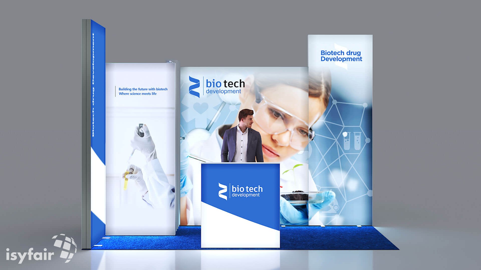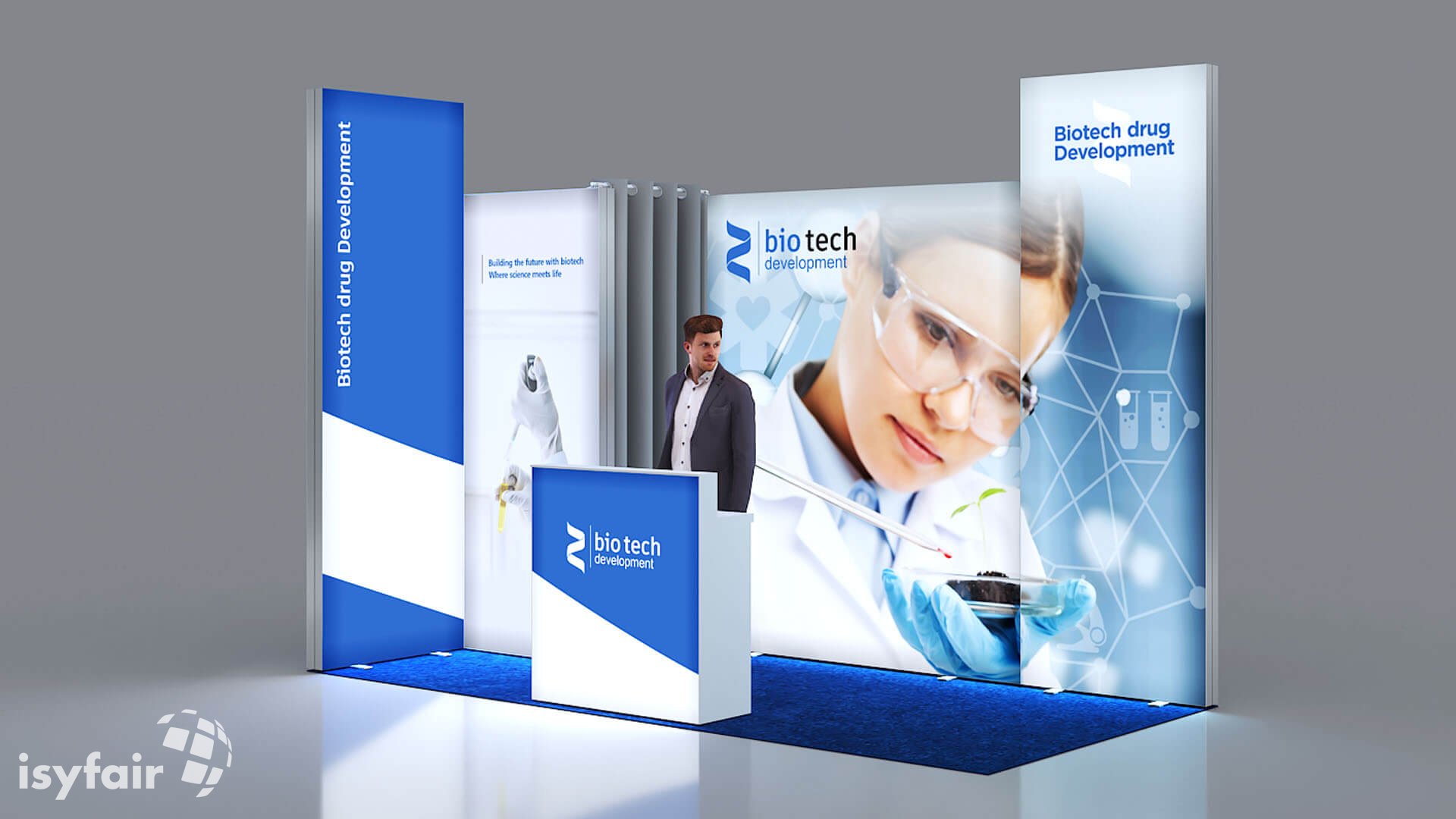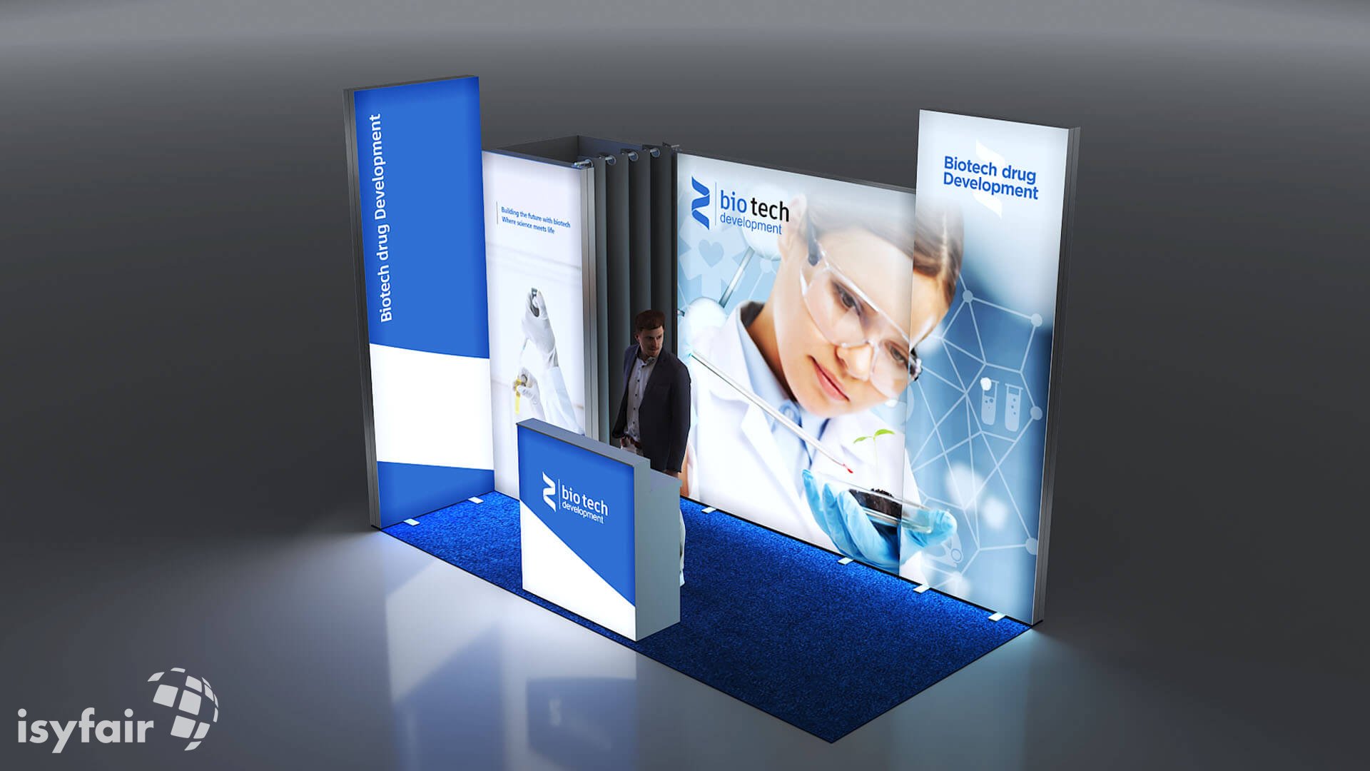 Dit design kan natuurlijk helemaal worden aangepast naar jouw wensen en eisen. Laat ons weten wat je plannen zijn en welke eisen je stelt aan jouw stand, dan maakt ons design-team een concept op maat voor je. Stuur ons een mail op info@ISYFAIR.com of bel ons op (+31) (0) 6 22690489.