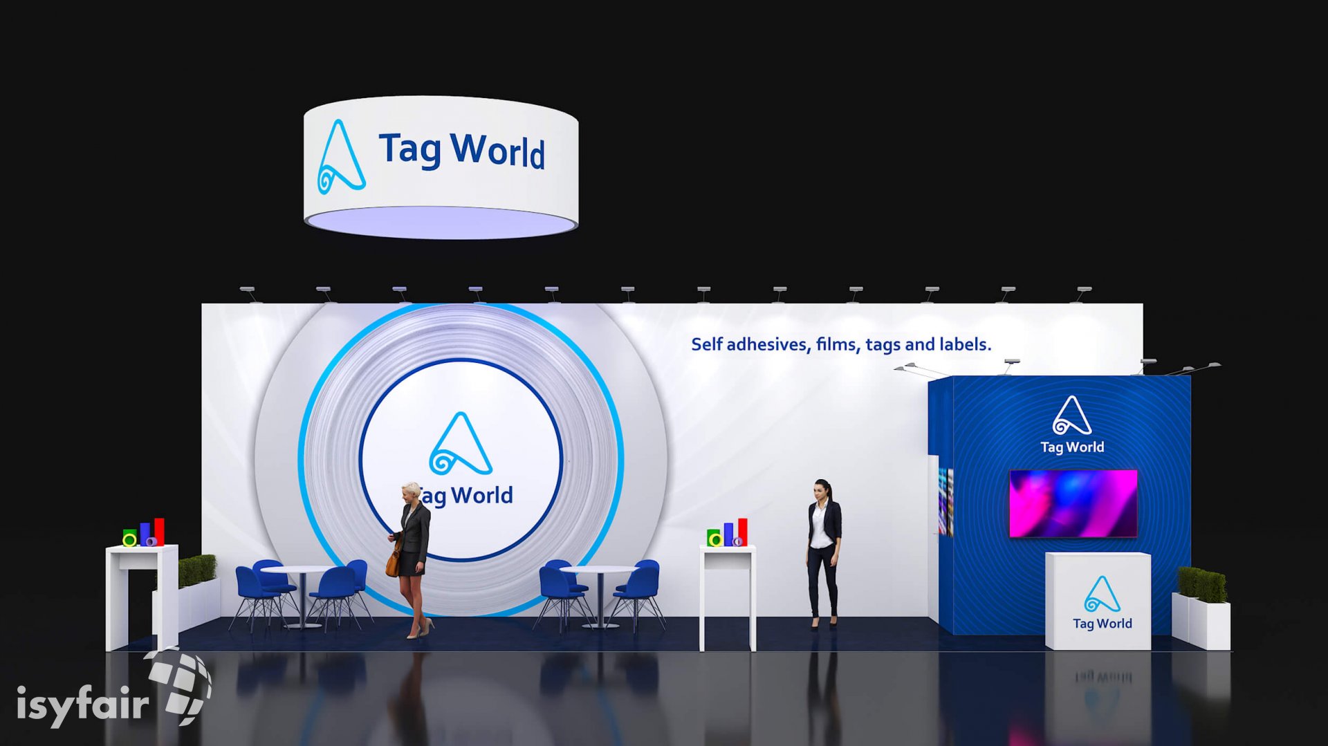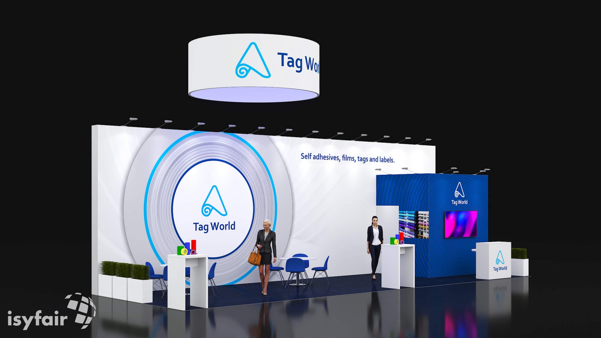 Alle bedrukkingen zoals logo's, foto's en teksten voor de volledige stand zijn bij de prijs inbegrepen. In sommige designs hangen 'Hanging Banners' boven de stand. Ook die zijn inclusief. - Verlichting