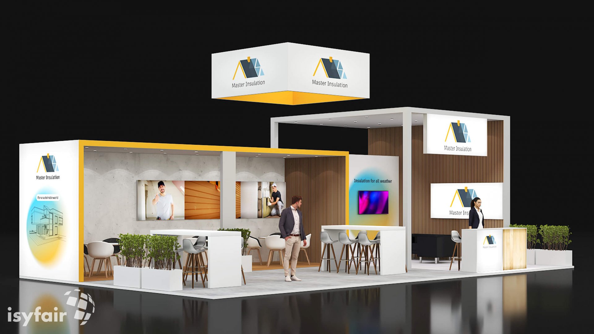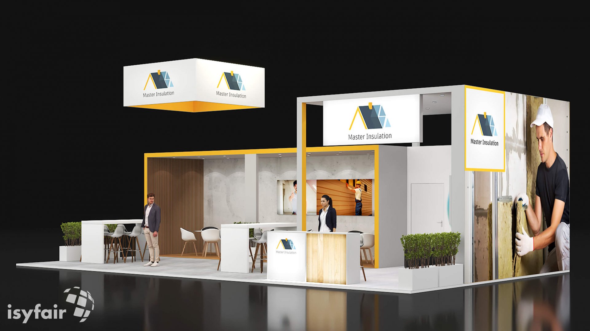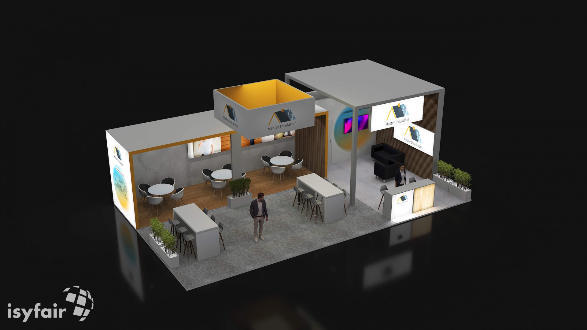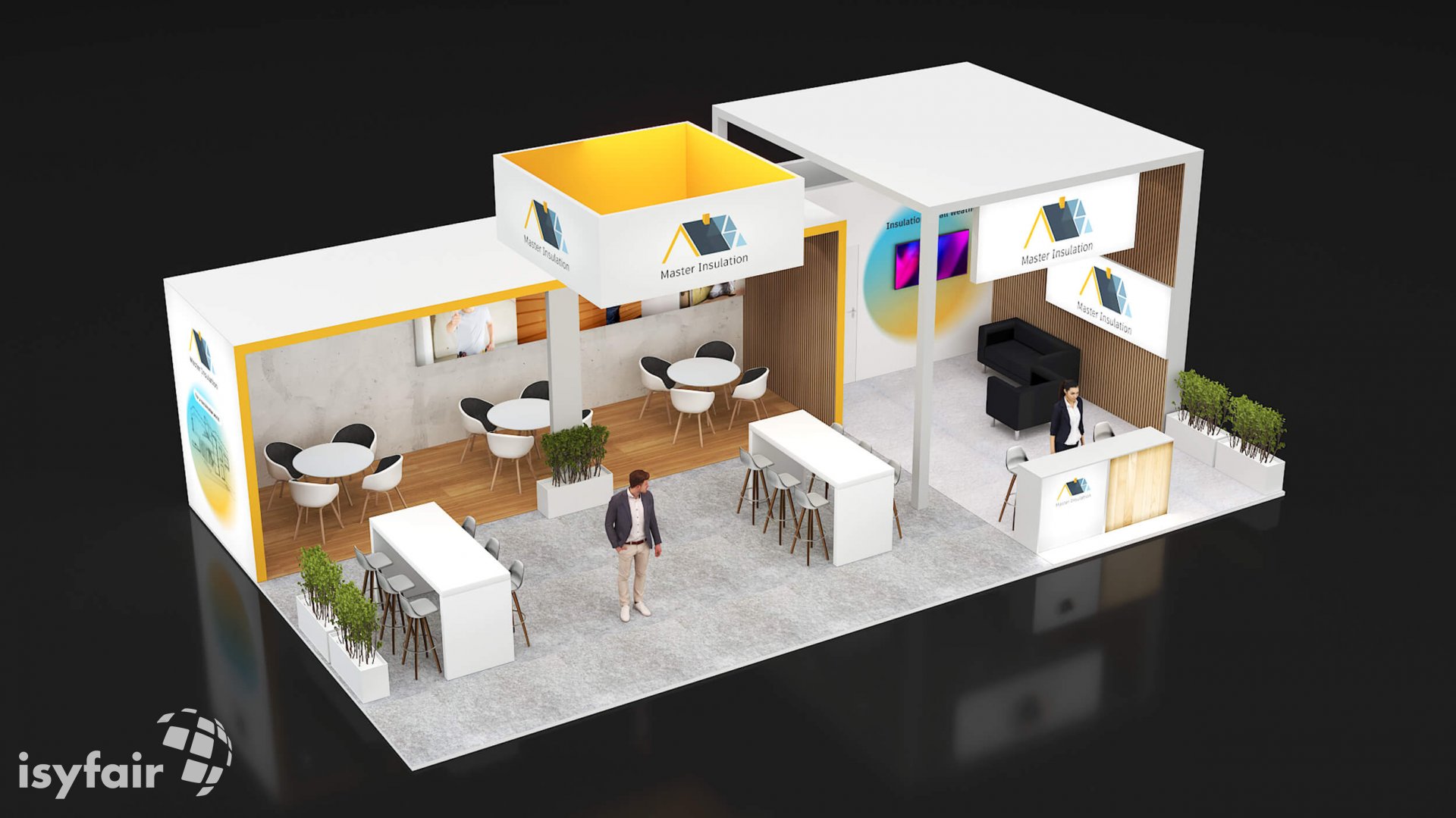 Dit design kan natuurlijk helemaal worden aangepast naar jouw wensen en eisen. Laat ons weten wat je plannen zijn en welke eisen je stelt aan jouw stand, dan maakt ons design-team een concept op maat voor je. Stuur ons een mail op info@ISYFAIR.com of bel ons op (+31) (0) 6 22690489.