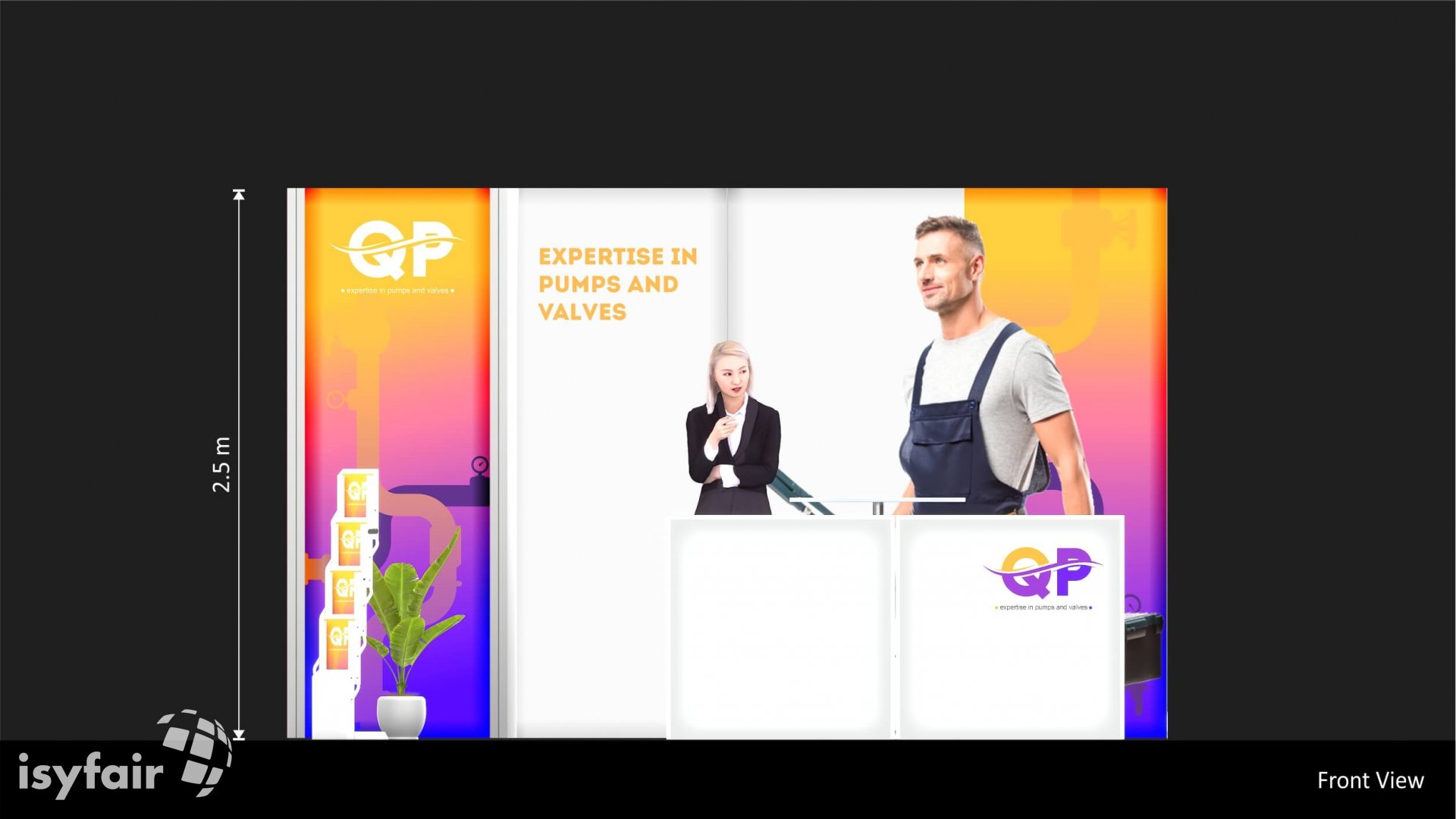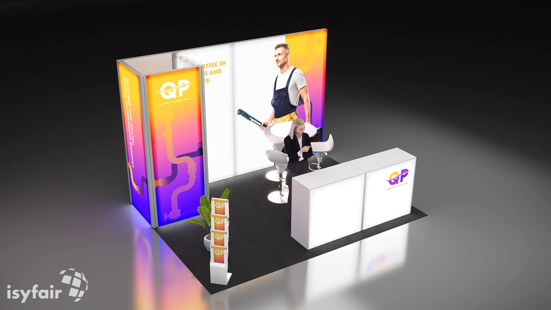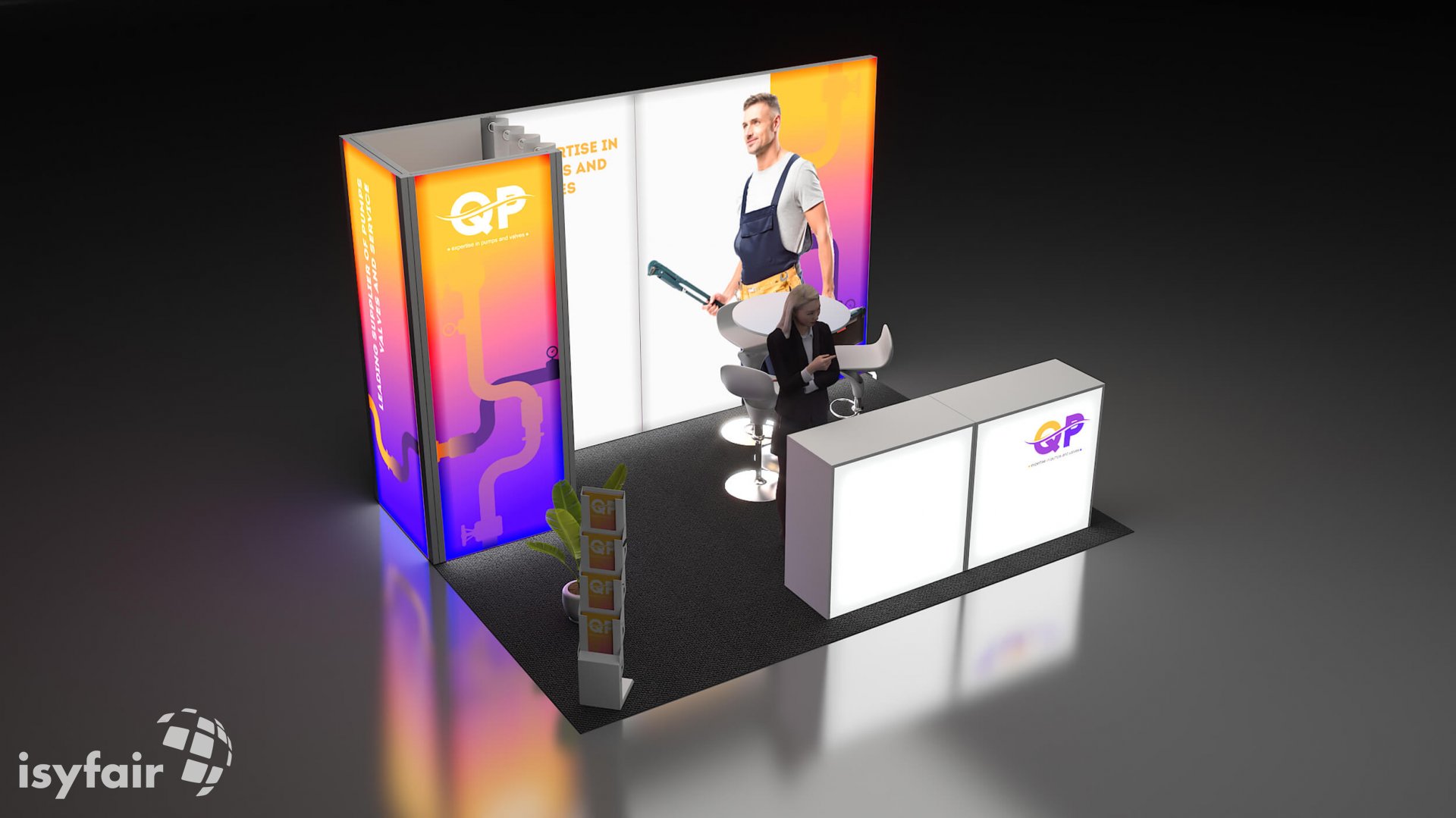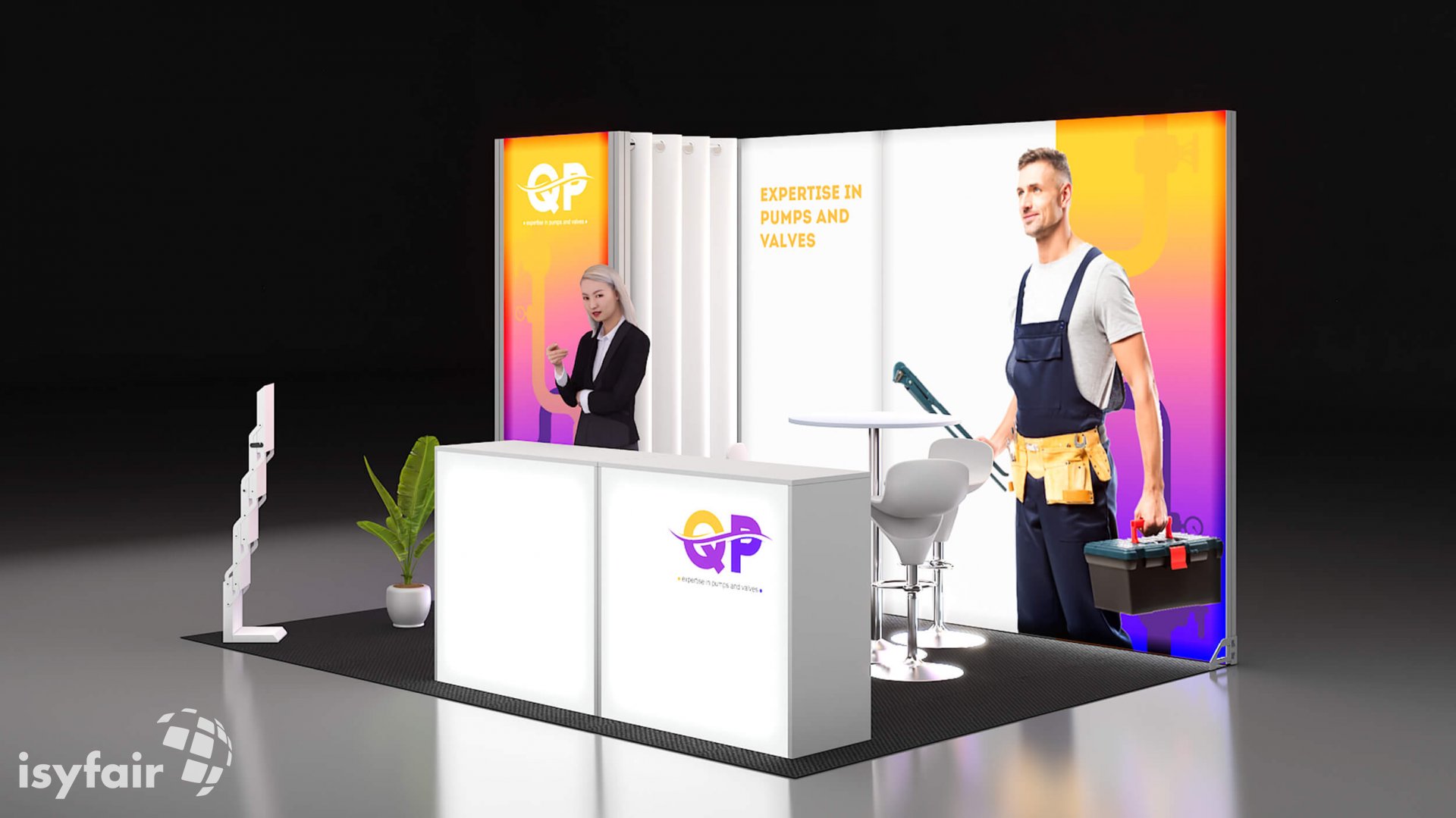Dit design kan natuurlijk helemaal worden aangepast naar jouw wensen en eisen. Laat ons weten wat je plannen zijn en welke eisen je stelt aan jouw stand, dan maakt ons design-team een concept op maat voor je. Stuur ons een mail op info@ISYFAIR.com of bel ons op (+31) (0) 6 22690489.